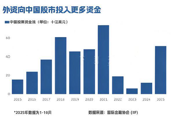 国际金融协会(IIF)数据显示,今年 1-10 月,外资对中国股票的投资力度升至四年来最高,前十个月流入资金合计超 500 亿美元,较 2024 年全年(114 亿美元)增长超 3 倍。联想集团等中国科技股近期接连获得外资机构上调目标价甚至直接增配。