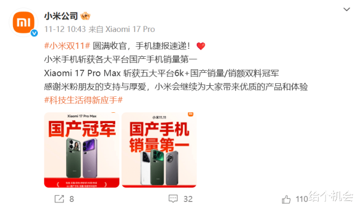 在双11活动结束之后,官方也是第一时间公布战报,小米手机斩获各大平台国产手机销量第一,雷军转发并表示谢谢大家支持。