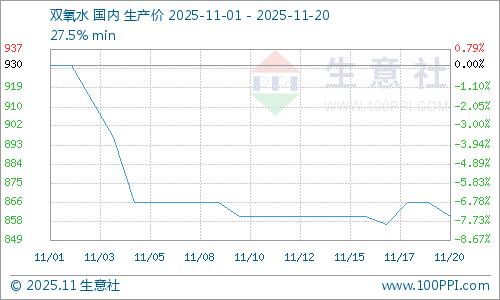 据生意社商品分析系统显示:11月以来,双氧水行情继续走弱,价格持续探底。11月1日,双氧水市场均价930元/吨,11月20日,双氧水市场均价860元/吨,价格下跌7.53%。