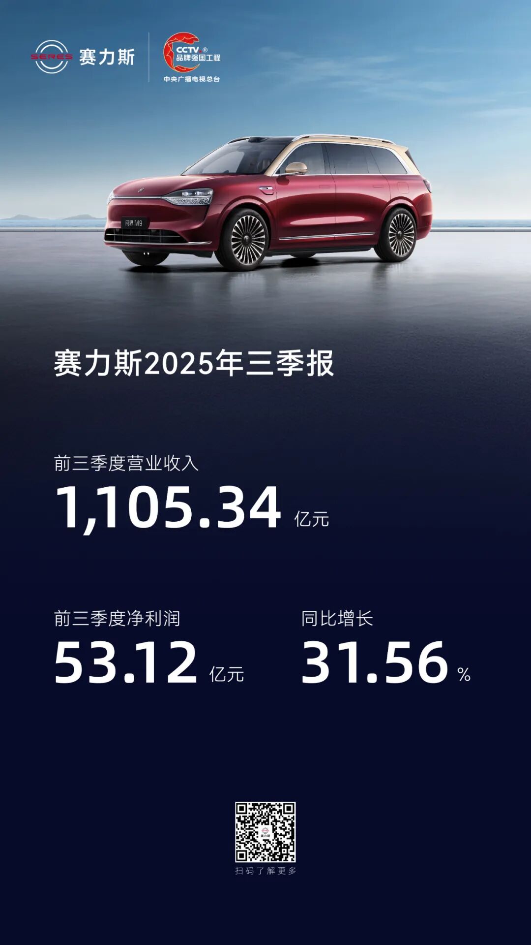 10月30日,赛力斯发布2025年三季报。报告显示,赛力斯前三季度实现营业收入1,105.34亿元,归属于上市公司股东的净利润53.12亿元,同比增长31.56%。